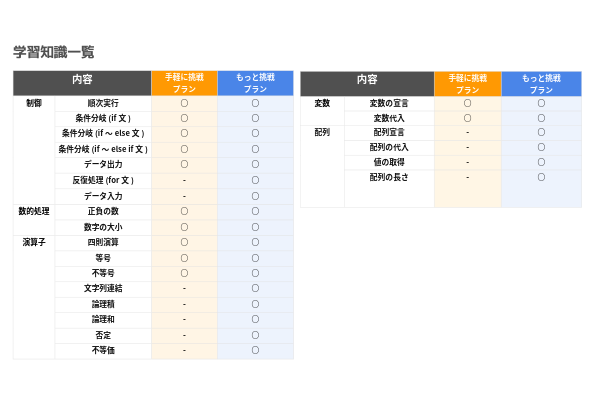 「手軽に挑戦プラン」では2日間、「もっと挑戦プラン」では合計4日間の学習期間を設け、以下の内容を学習します。