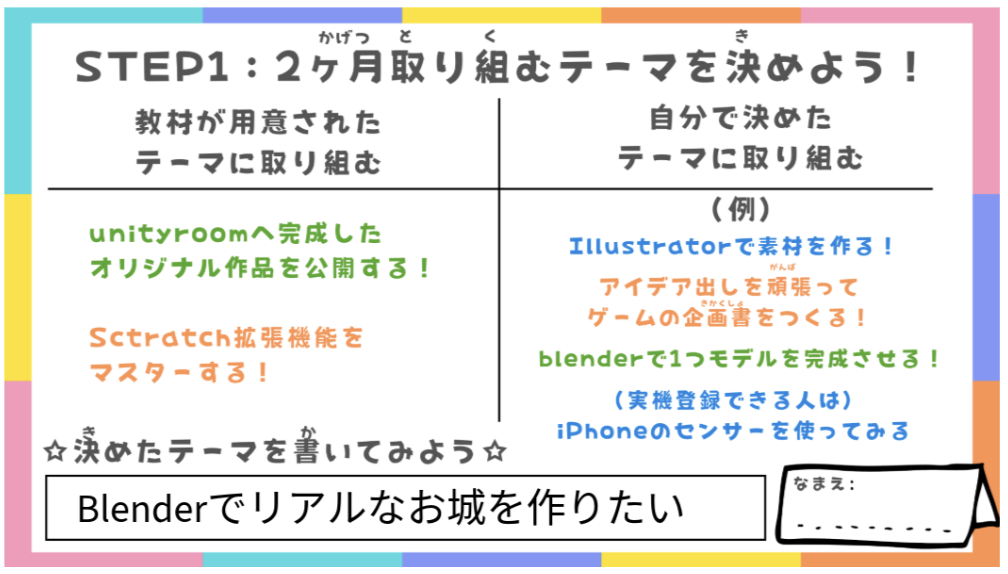 トレーニングタイムでは、学習Stgaeに応じて小規模な作品開発や発表練習・タイピング等を行い、プログラミング学習の意欲向上や興味関心の幅を広げる機会の創出を図るため、様々な内容を実施しています。