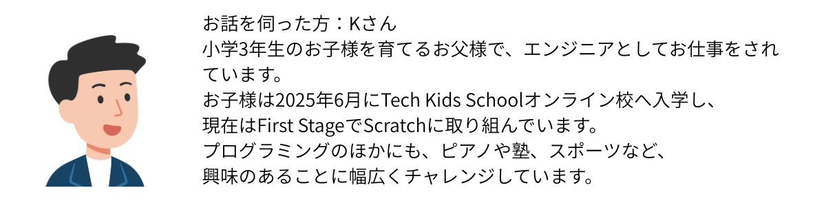 今回は、長期継続学習コース「Tech Kids School」オンライン校で受講をされているご家庭に、実際の体験やお子様の変化についてお話を伺いました!