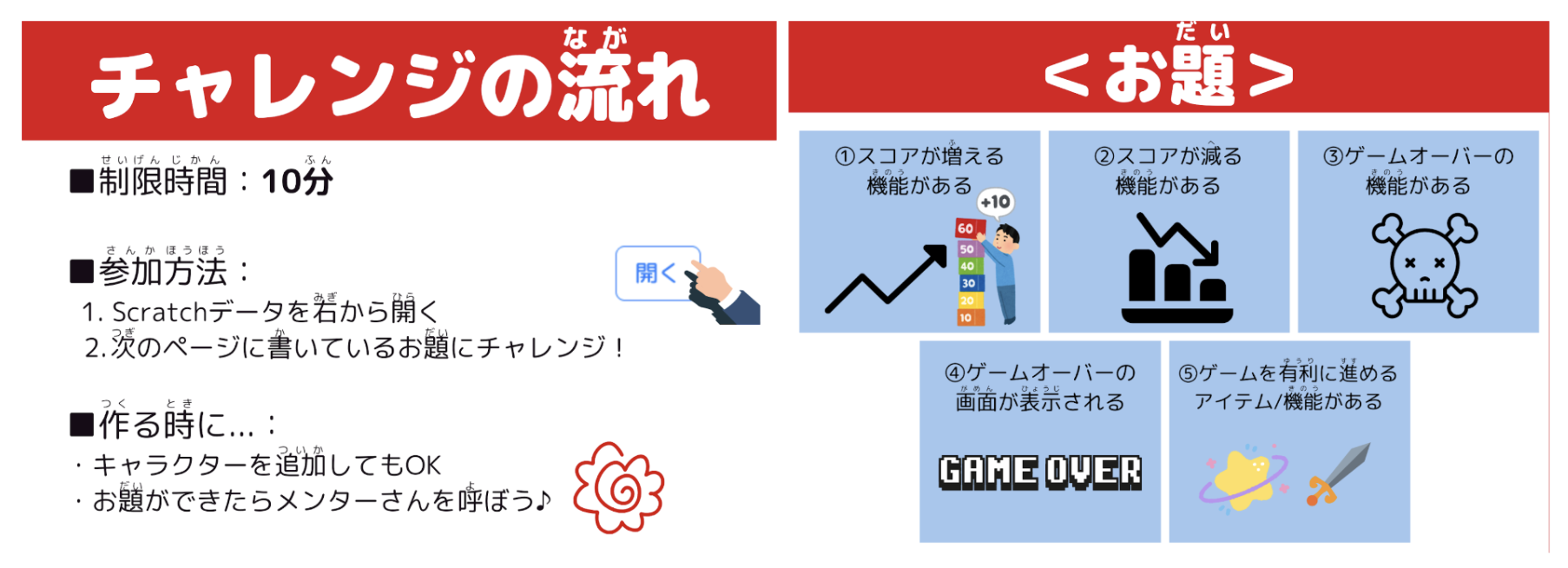 この企画は、基本的な動きのみがプログラムされたゲームをベースに、出題されたお題に沿った機能を、制限時間10分間の中でできるだけ多く作成するイベントです。