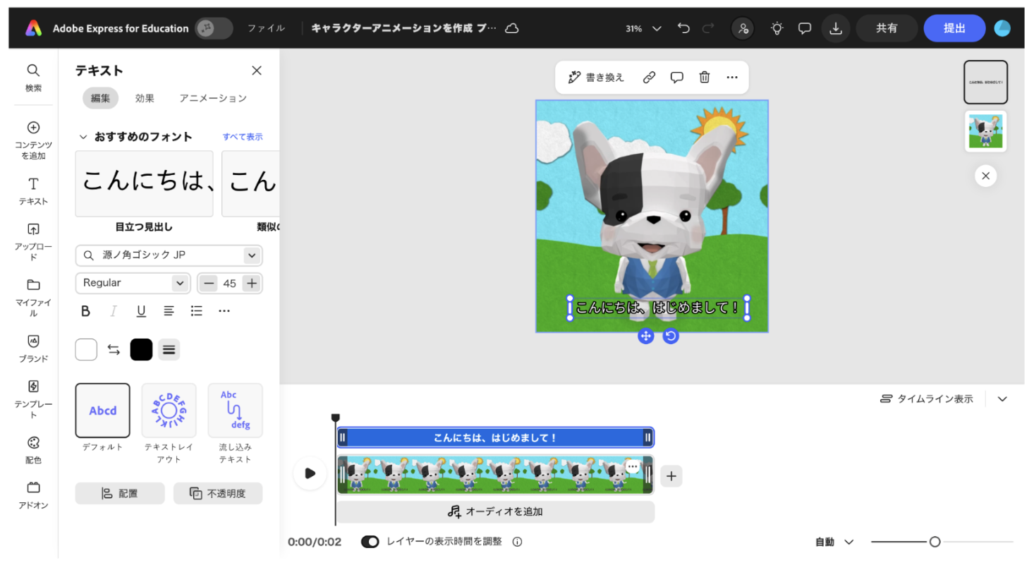 Adobe Expressのキャラクターアニメーション作成機能は、専門的な動画編集の知識がなくても、用意されたキャラクターに音声や文字を入力するだけで、キャラクターが話しているようなアニメーションを簡単に作成できます。