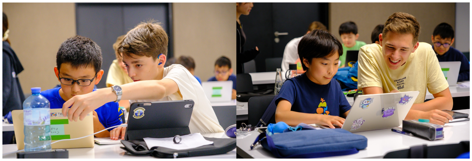 最初は「英語、通じるかな…?」と不安そうにしていた子どもたちも、作業が進むにつれて、画面を見せ合いながら必要な部分を確認し合うやり取りが自然と見られるようになりました。コードの動きを指差して相談したり、相手の意図を確認しながら進めたりと、開発という共通の作業を通じて少しずつコミュニケーションが生まれていく様子が印象的でした。
