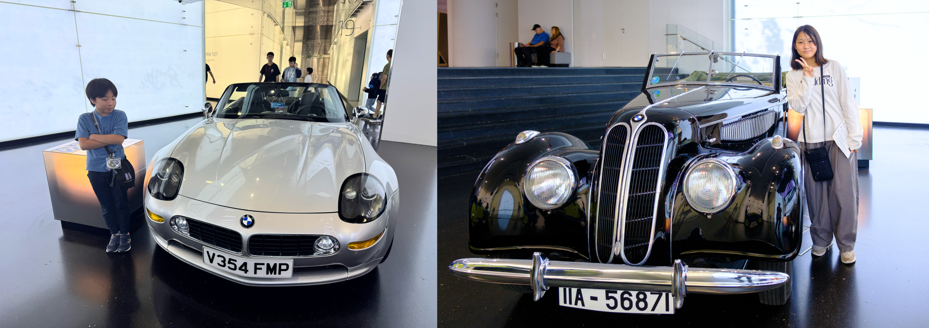 BMWのバイクにまたがって写真を撮るスポットでは、思い思いに撮影を楽しむ姿が見られました。最後はBMWの歴代の名車が展示されている広場へ。子どもたちはお気に入りの車を見つけて、一緒に記念撮影を行いました!