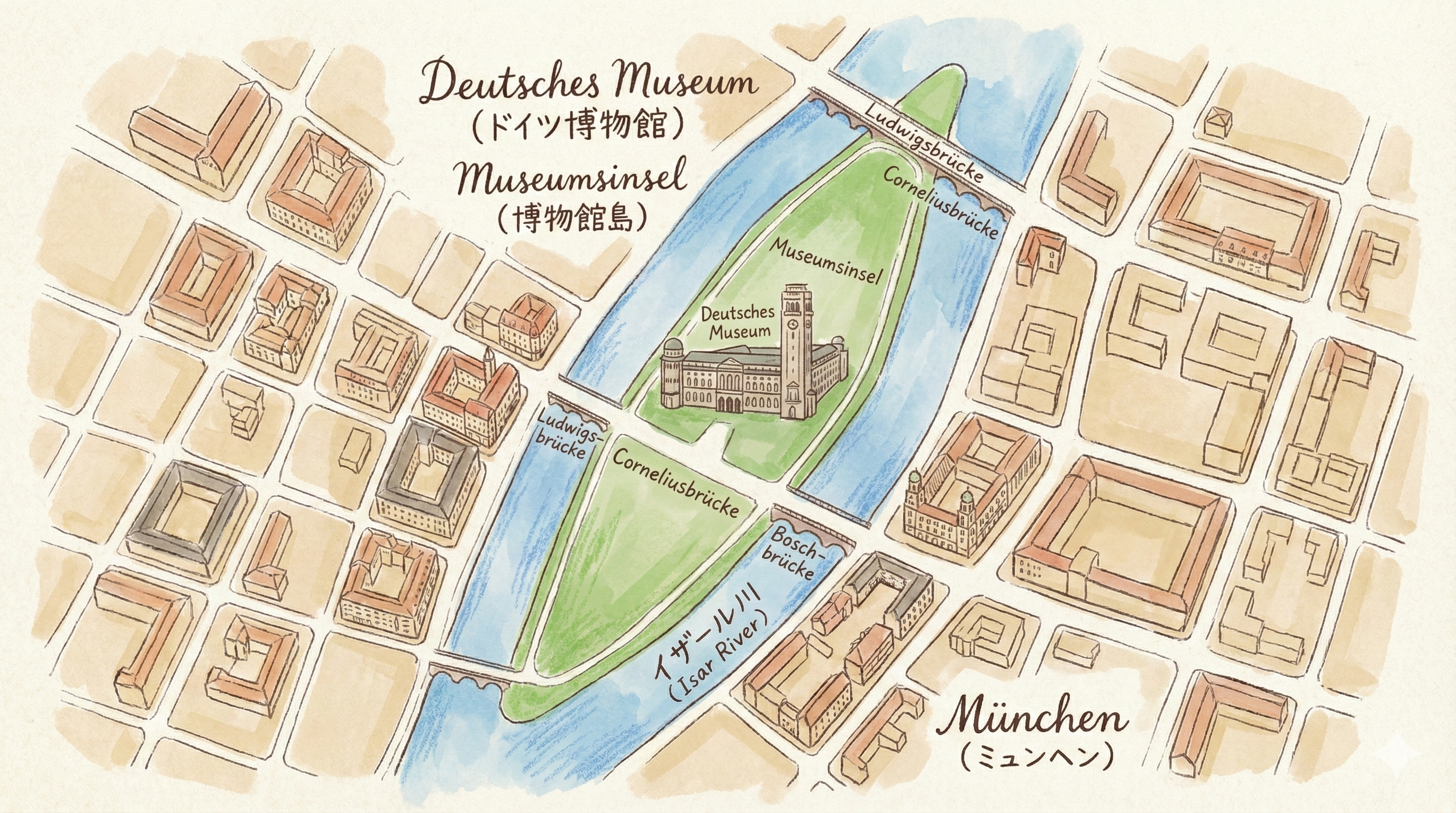 午後は、イザール川の中州にある「ドイツ博物館」へ向かいました。ここは島全体がひとつの博物館になっており、その規模は世界最大級。すべての展示を見て回るには、総距離にして約16kmも歩く必要があると言われています。実際に足を踏み入れると、自然科学から工学、通信に至るまで、果てしない展示の数々に圧倒されました。特に、大きな吹き抜けに何機もの航空機が吊り下げられたエリアは圧巻。そのダイナミックな光景に見入ってしまいました。